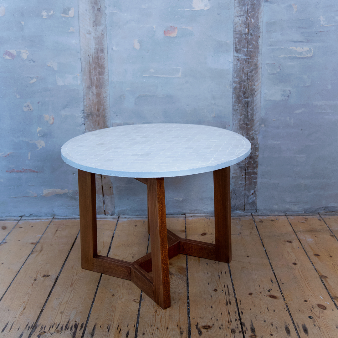 Vælg det unikke håndlavede mosaikbord med mørkbejdset egetræsstel for at tilføje en dekorativ og autentisk touch til din eller kunders indretning. Dette bord er skabt ved hjælp af marokkanske teknikker og håndværksmæssige færdigheder, kombineret med nordiske farver og en lysere stil. Marokkansk mosaik er kendt for at være lavet ved at samle bordpladen af små keramikstykker, ofte i mønstre eller billeder. Vores udvalg af mosaikborde er præget af en minimalistisk og enkel stil, med enkle jordfarver og skandinavisk enkelhed, men med en bred vifte af farver fra den marokkanske kultur.